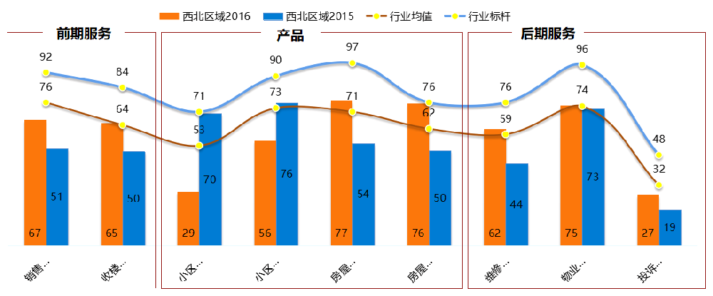 從下方圖形中可看出:XXXX西北區(qū)域業(yè)主在銷(xiāo)售服務(wù)、收樓交房、房屋設(shè)計(jì)、房屋質(zhì)量、維修服務(wù)、物業(yè)服務(wù)、投訴處理七大方面的滿意度評(píng)價(jià)相比去年有所提升,但業(yè)主對(duì)小區(qū)配套、小區(qū)環(huán)境和規(guī)劃兩個(gè)方面的滿意度評(píng)價(jià)相比去年有所下降,每個(gè)客戶體驗(yàn)端口與行業(yè)均值*及行業(yè)標(biāo)桿*均存在較大差距,所以后期仍需努力提升。