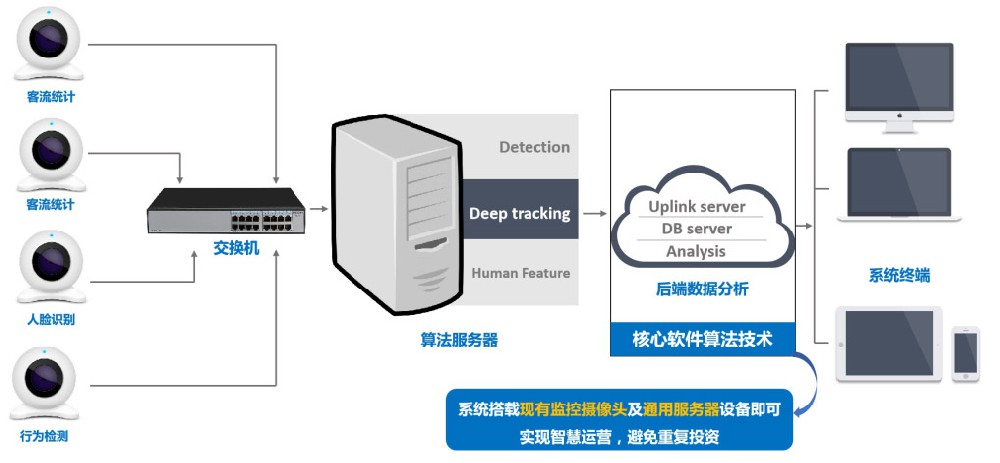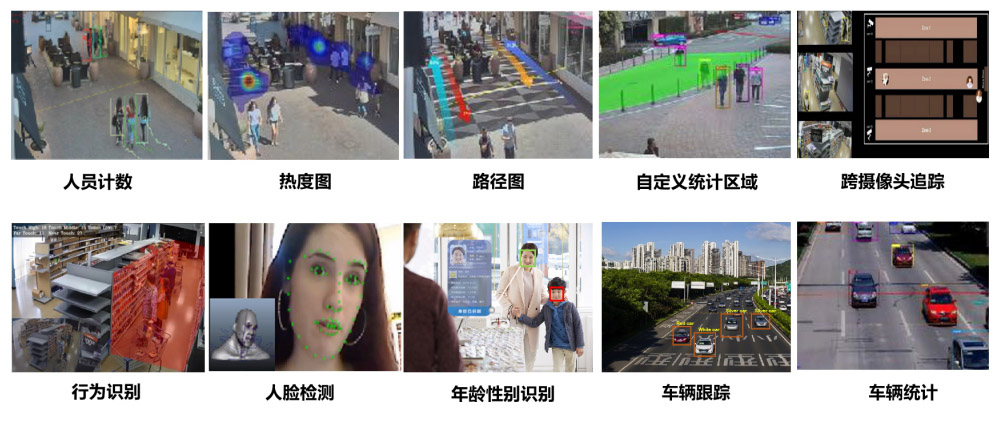 客流大數(shù)據(jù)監(jiān)測(cè)技術(shù)人工智能視頻分析解決方案平臺(tái)涵蓋目標(biāo)檢測(cè)、人臉識(shí)別、行為分析、跨攝像頭重識(shí)別四大核心技術(shù)。