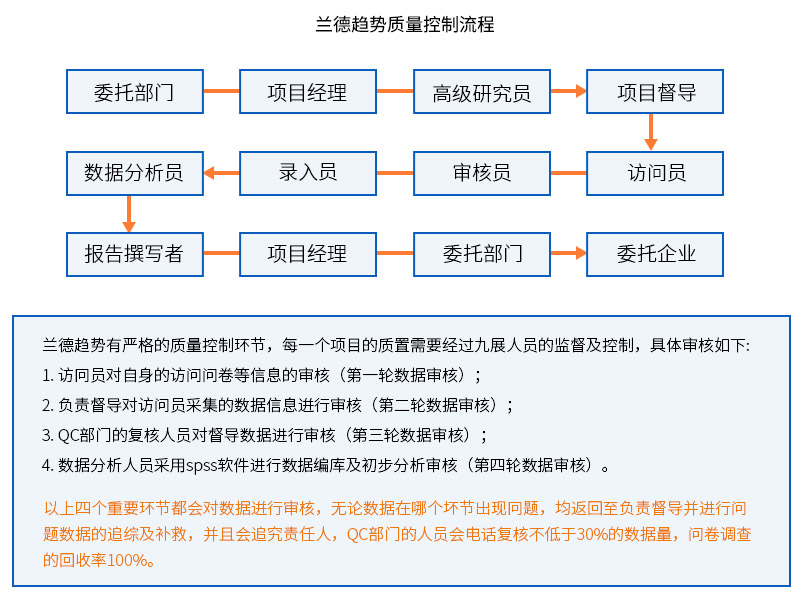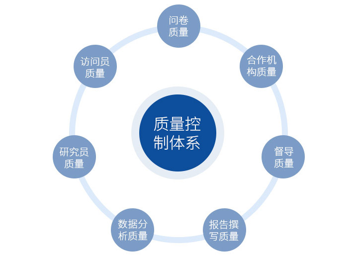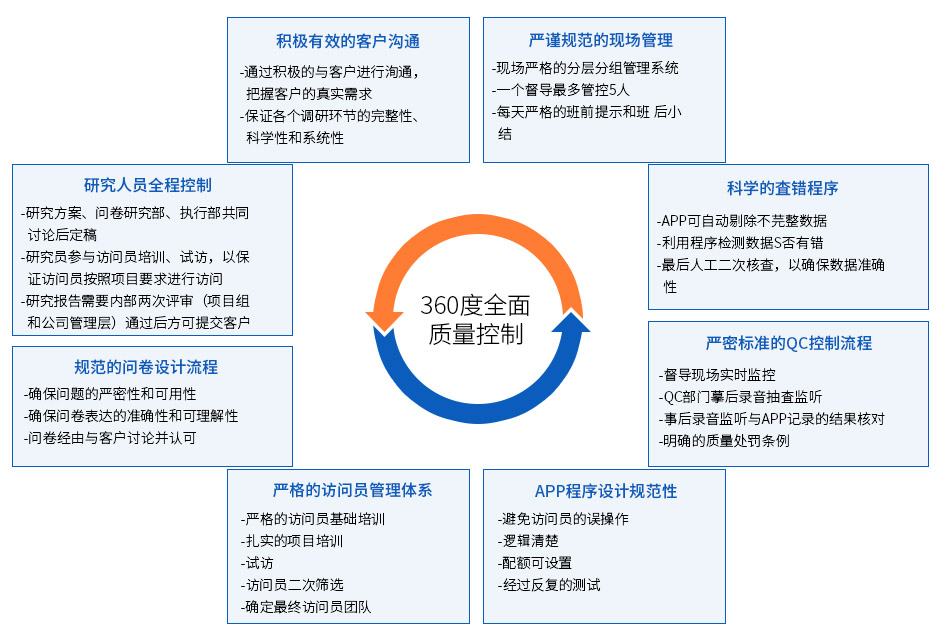 蘭德趨勢秉承客觀、專業(yè)、高效的服務(wù)理念,在各個(gè)環(huán)節(jié)均有嚴(yán)格的質(zhì)量控制體系,堅(jiān)持360度全面質(zhì)量管理,并于2008年自主編寫訪問員手冊及督導(dǎo)執(zhí)行手冊,截止目前進(jìn)行了三次修訂,更加規(guī)范了項(xiàng)目執(zhí)行流程,確保了數(shù)據(jù)的真實(shí)有效,360度全面質(zhì)量控制圖如下: